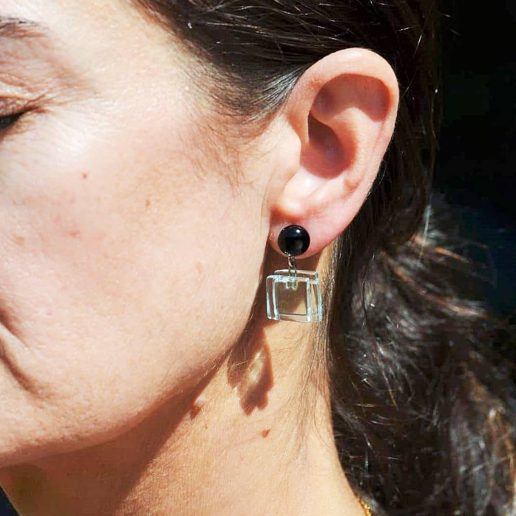 Están compuestos por tres láminas de vidrio reciclado incoloro y una bolita de vidrio de murano, blanco o negro, para la parte superior. Elaborados completamente a mano.
